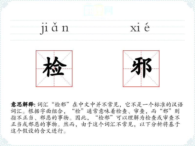 词汇“检邪”在中文中并不常见,它不是一个标准的汉语词汇。根据字面组合,“检”通常意味着检查、审查,而“邪”则指不正当、邪恶的事物。因此,“检邪”可以理解为检查或审查不正当或邪恶的事物。然而,由于这个词汇不常见,以下分析将基于这个假设的含义进行。