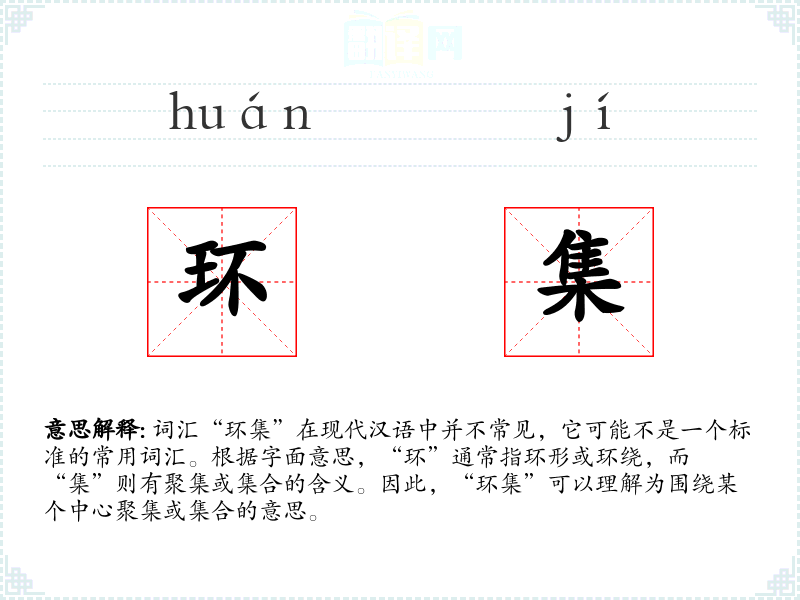 词汇“环集”在现代汉语中并不常见,它可能不是一个标准的常用词汇。根据字面意思,“环”通常指环形或环绕,而“集”则有聚集或集合的含义。因此,“环集”可以理解为围绕某个中心聚集或集合的意思。