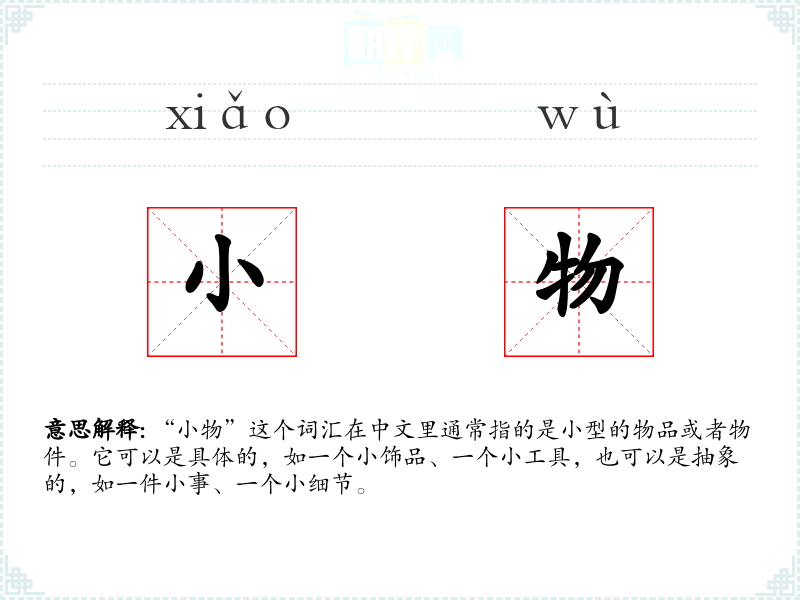 “小物”这个词汇在中文里通常指的是小型的物品或者物件。它可以是具体的,如一个小饰品、一个小工具,也可以是抽象的,如一件小事、一个小细节。