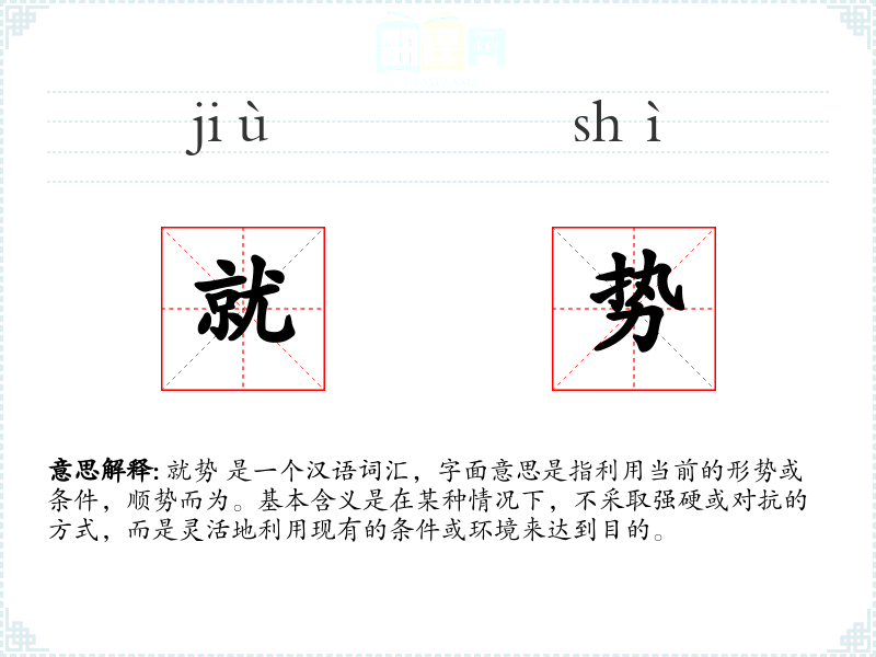 就势 是一个汉语词汇,字面意思是指利用当前的形势或条件,顺势而为。基本含义是在某种情况下,不采取强硬或对抗的方式,而是灵活地利用现有的条件或环境来达到目的。