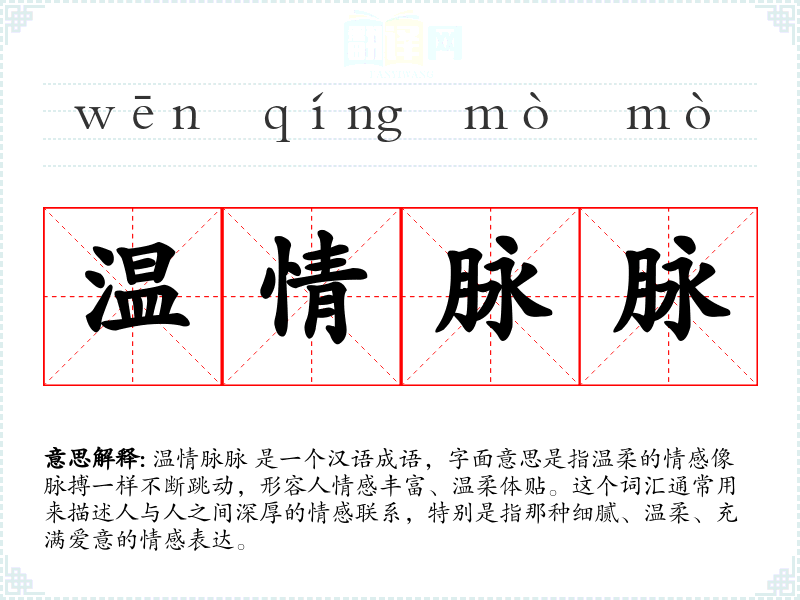 温情脉脉 是一个汉语成语,字面意思是指温柔的情感像脉搏一样不断跳动,形容人情感丰富、温柔体贴。这个词汇通常用来描述人与人之间深厚的情感联系,特别是指那种细腻、温柔、充满爱意的情感表达。