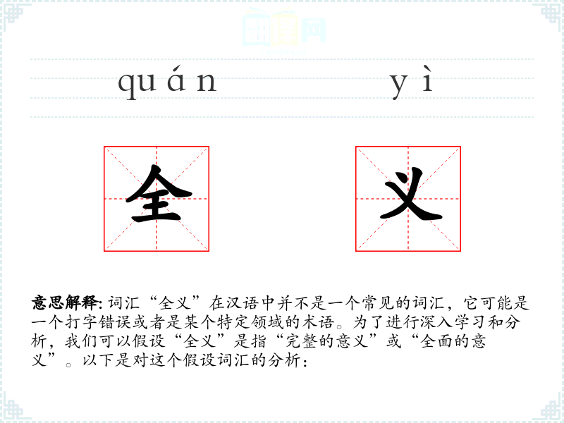- 口语:在日常对话中,“全义”可能用来强调某个观点或解释的全面性,避免误解。