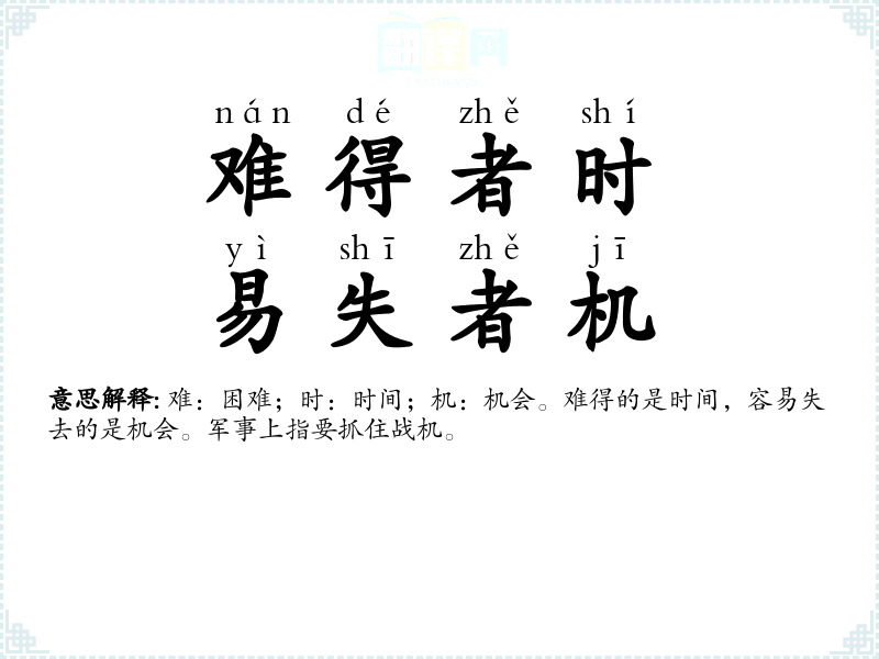 难:困难;时:时间;机:机会。难得的是时间,容易失去的是机会。军事上指要抓住战机。