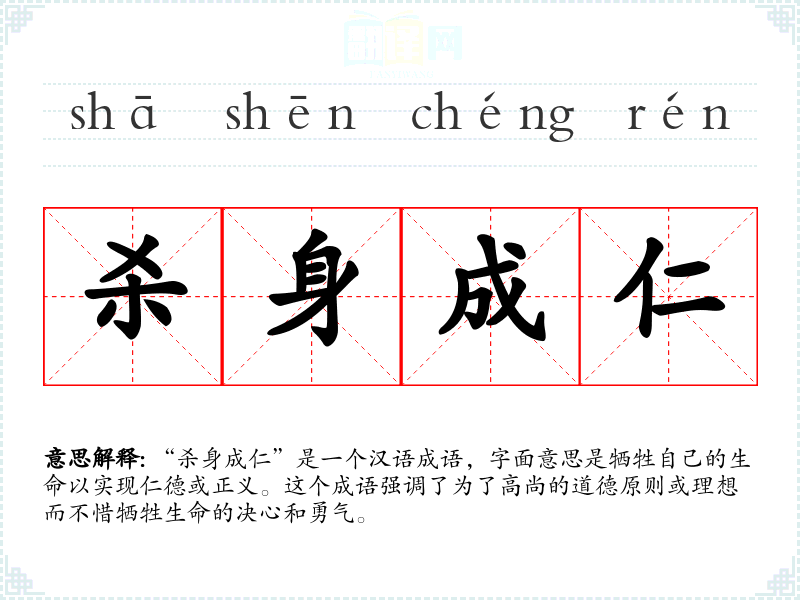 “杀身成仁”是一个汉语成语,字面意思是牺牲自己的生命以实现仁德或正义。这个成语强调了为了高尚的道德原则或理想而不惜牺牲生命的决心和勇气。