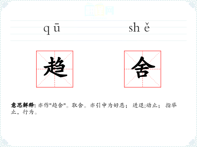 亦作"趋舍"。取舍。亦引申为好恶; 进退;动止; 指举止,行为。