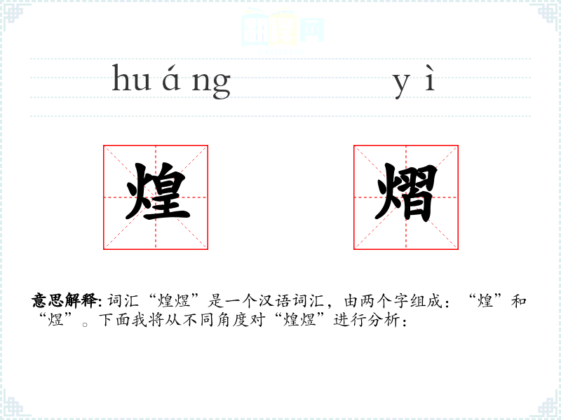 词汇“煌煜”是一个汉语词汇,由两个字组成:“煌”和“煜”。下面我将从不同角度对“煌煜”进行分析:
