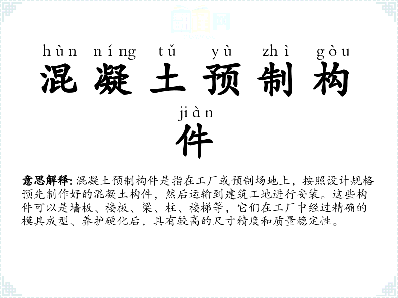 在不同语言中,如英语中的“precast concrete element”或“prefabricated concrete component”,虽然表达方式不同,但都指向同一概念。