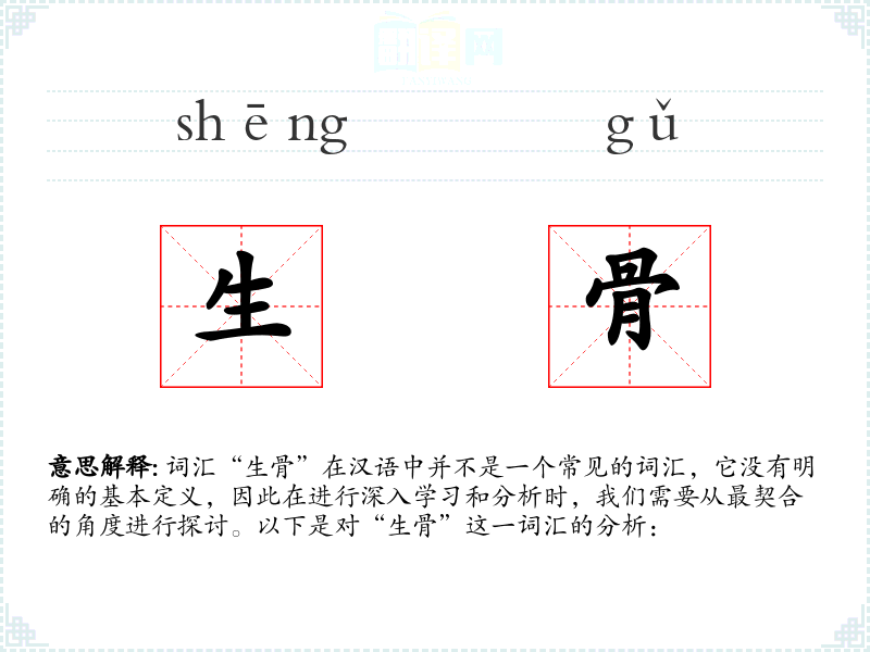 由于“生骨”不是一个标准的汉语词汇,我们无法给出确切的基本定义。但从字面意思来看,“生”通常与生命、生长相关,而“骨”则指骨骼。因此,“生骨”可能指的是新生的骨骼或者与骨骼生长相关的事物。