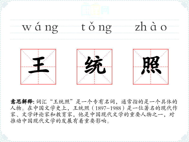 词汇“王统照”是一个专有名词,通常指的是一个具体的人物。在文学史上,王统照(17-1988)是一位著名的现代作家、文学评论家和教育家,他是现代文学的重要人物之一,对推动现代文学的发展有着重要影响。
