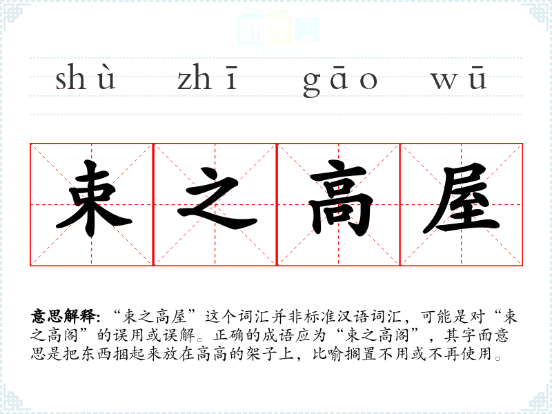 “束之高屋”这个词汇并非标准汉语词汇,可能是对“束之高阁”的误用或误解。正确的成语应为“束之高阁”,其字面意思是把东西捆起来放在高高的架子上,比喻搁置不用或不再使用。