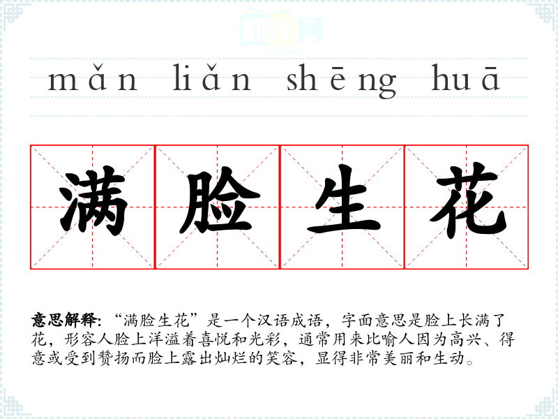 “满脸生花”是一个汉语成语,字面意思是脸上长满了花,形容人脸上洋溢着喜悦和光彩,通常用来比喻人因为高兴、得意或受到赞扬而脸上露出灿烂的笑容,显得非常美丽和生动。