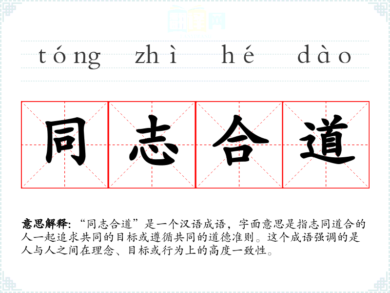 “同志合道”是一个汉语成语,字面意思是指志同道合的人一起追求共同的目标或遵循共同的道德准则。这个成语强调的是人与人之间在理念、目标或行为上的高度一致性。