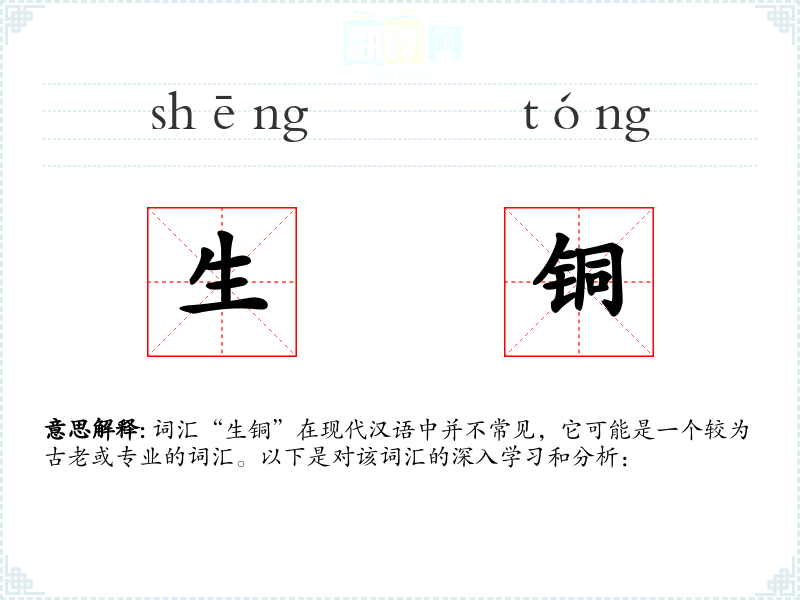 词汇“生铜”在现代汉语中并不常见,它可能是一个较为古老或专业的词汇。以下是对该词汇的深入学*和分析: