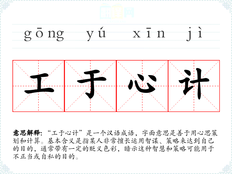 “工于心计”是一个汉语成语,字面意思是善于用心思策划和计算。基本含义是指某人非常擅长运用智谋、策略来达到自己的目的,通常带有一定的贬义色彩,暗示这种智慧和策略可能用于不正当或自私的目的。