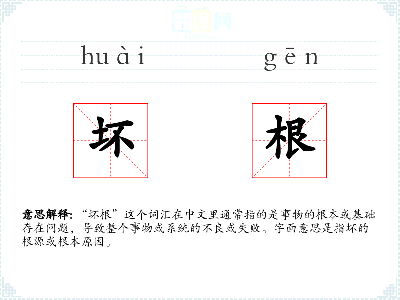 “坏根”这个词汇的词源较为直接,由“坏”和“根”两个字组成,没有复杂的演变历史。在中文中,“根”字自古以来就有根本、基础的含义,而“坏”字则表示不好或损坏。