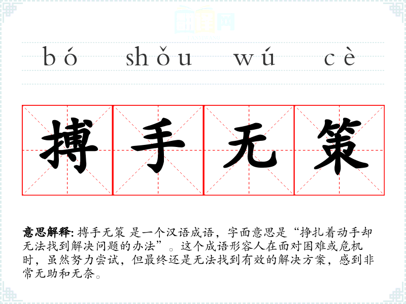 搏手无策 是一个汉语成语,字面意思是“挣扎着动手却无法找到解决问题的办法”。这个成语形容人在面对困难或危机时,虽然努力尝试,但最终还是无法找到有效的解决方案,感到非常无助和无奈。