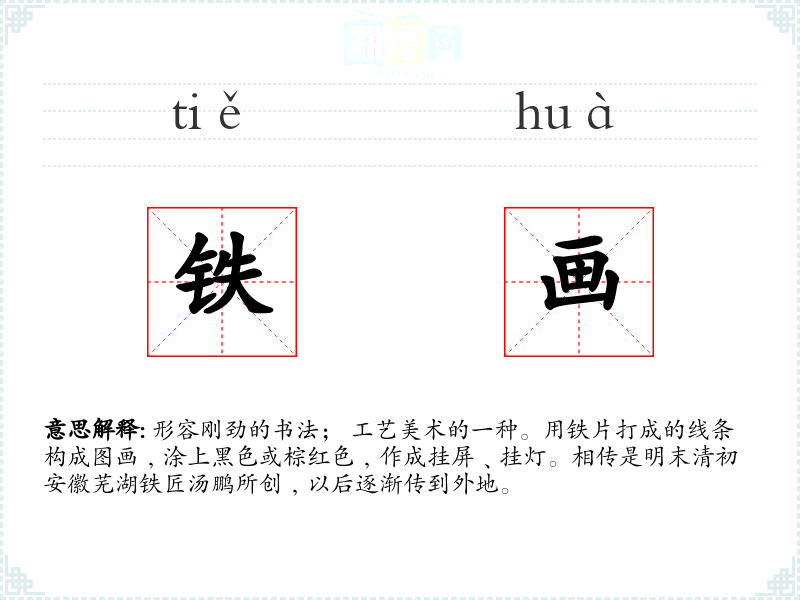 形容刚劲的书法; 工艺美术的一种。用铁片打成的线条构成图画﹐涂上黑色或棕红色﹐作成挂屏﹑挂灯。相传是明末清初安徽芜湖铁匠汤鹏所创﹐以后逐渐传到外地。