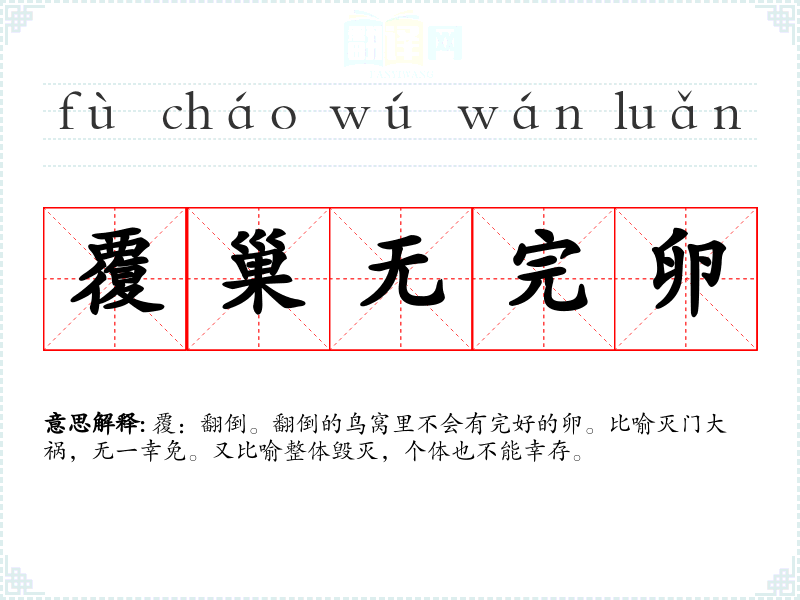 覆:翻倒。翻倒的鸟窝里不会有完好的卵。比喻灭门大祸,无一幸免。又比喻整体毁灭,个体也不能幸存。