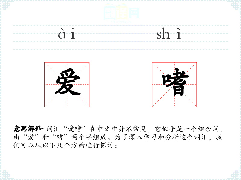词汇“爱嗜”在中文中并不常见,它似乎是一个组合词,由“爱”和“嗜”两个字组成。为了深入学*和分析这个词汇,我们可以从以下几个方面进行探讨: