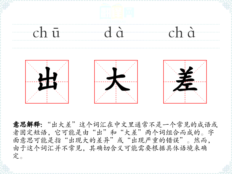 “出大差”这个词汇在中文里通常不是一个常见的成语或者固定短语,它可能是由“出”和“大差”两个词组合而成的。字面意思可能是指“出现大的差异”或“出现严重的错误”。然而,由于这个词汇并不常见,其确切含义可能需要根据具体语境来确定。