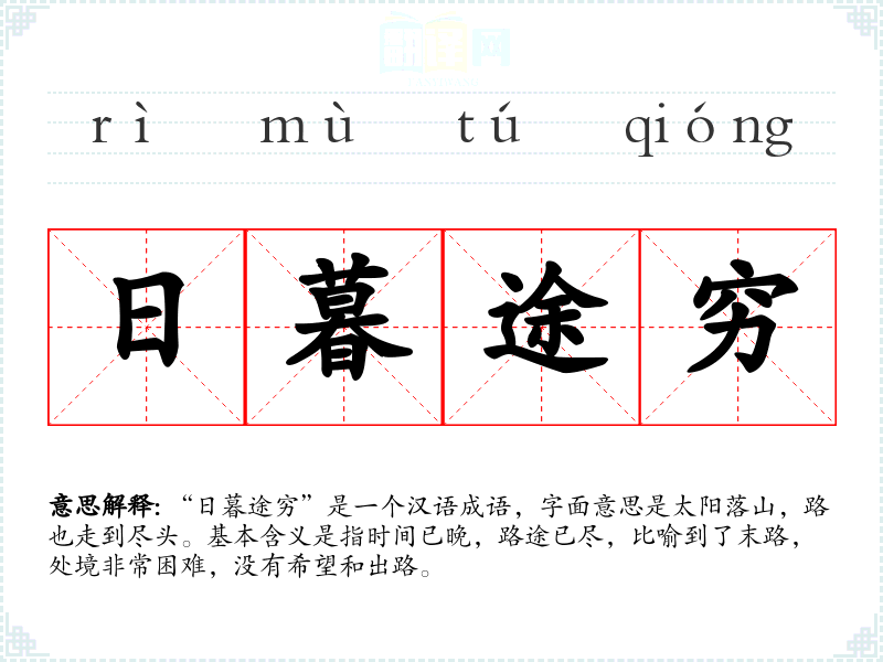 “日暮途穷”是一个汉语成语,字面意思是太阳落山,路也走到尽头。基本含义是指时间已晚,路途已尽,比喻到了末路,处境非常困难,没有希望和出路。