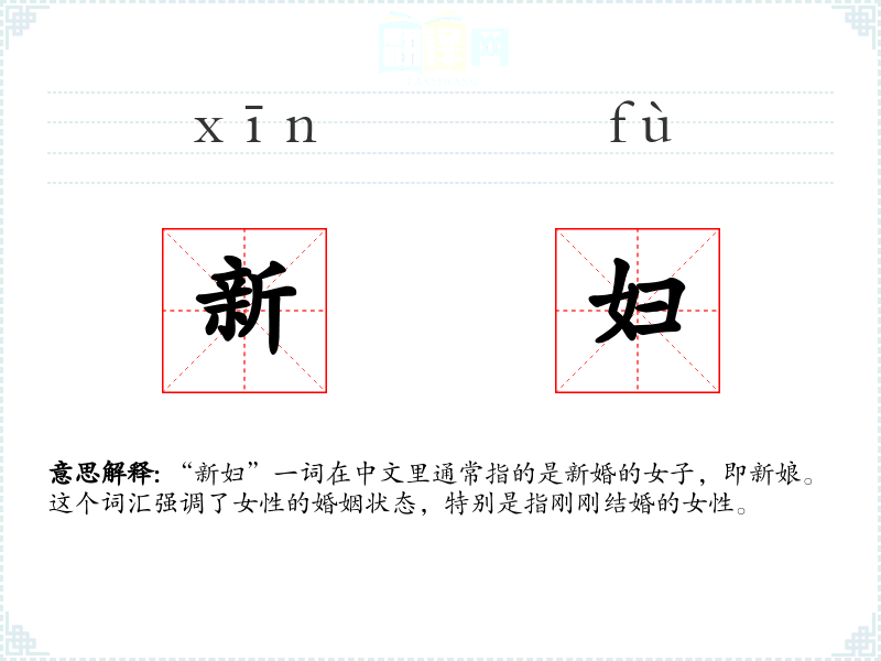 “新妇”一词在中文里通常指的是新婚的女子,即新娘。这个词汇强调了女性的婚姻状态,特别是指刚刚结婚的女性。