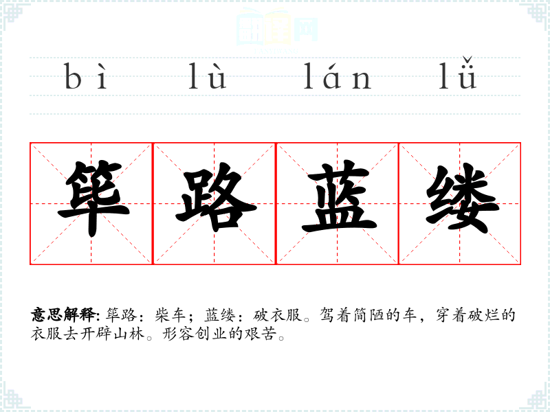 筚路:柴车;蓝缕:破衣服。驾着简陋的车,穿着破烂的衣服去开辟山林。形容创业的艰苦。
