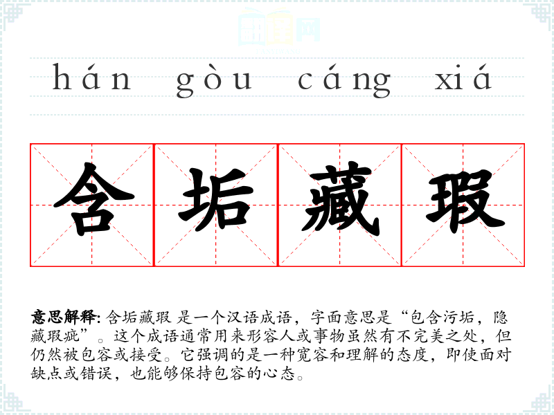含垢藏瑕 是一个汉语成语,字面意思是“包含污垢,隐藏瑕疵”。这个成语通常用来形容人或事物虽然有不完美之处,但仍然被包容或接受。它强调的是一种宽容和理解的态度,即使面对缺点或错误,也能够保持包容的心态。