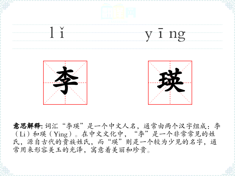 - 理解:李瑛作为一个中文名字,承载了丰富的文化意义和家族期望,是一个充满美感和期待的名字。