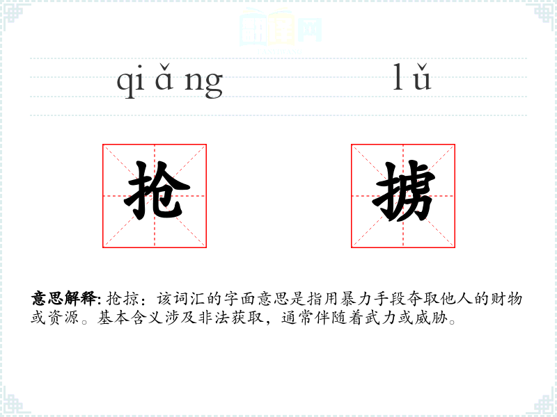 抢掠:该词汇的字面意思是指用暴力手段夺取他人的财物或资源。基本含义涉及非法获取,通常伴随着武力或威胁。