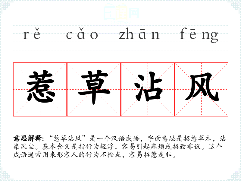 “惹草沾风”是一个汉语成语,字面意思是招惹草木,沾染风尘。基本含义是指行为轻浮,容易引起麻烦或招致非议。这个成语通常用来形容人的行为不检点,容易招惹是非。