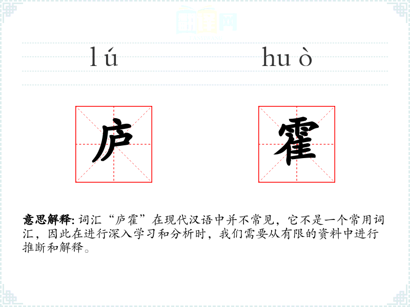 词汇“庐霍”在现代汉语中并不常见,它不是一个常用词汇,因此在进行深入学习和分析时,我们需要从有限的资料中进行推断和解释。
