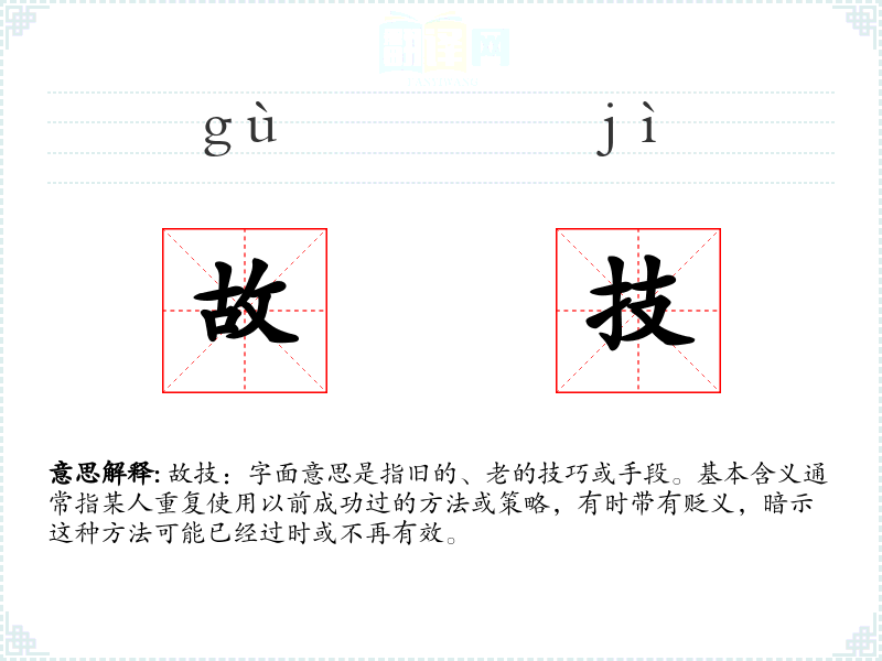 故技:字面意思是指旧的、老的技巧或手段。基本含义通常指某人重复使用以前成功过的方法或策略,有时带有贬义,暗示这种方法可能已经过时或不再有效。
