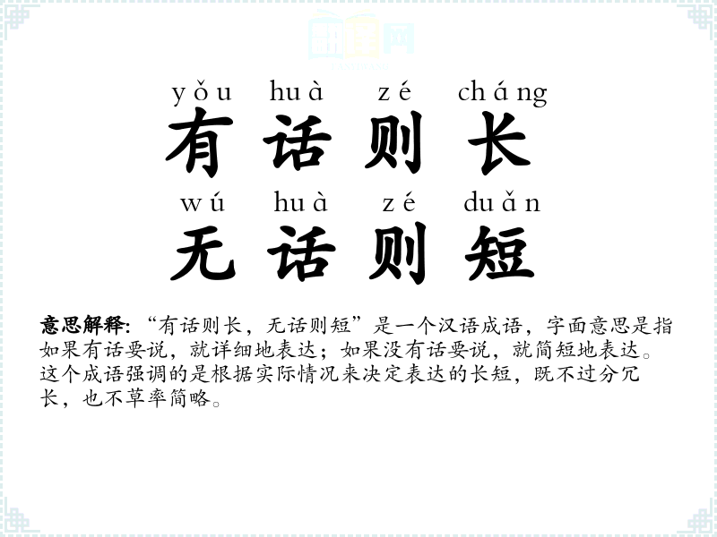 “有话则长,无话则短”是一个汉语成语,字面意思是指如果有话要说,就详细地表达;如果没有话要说,就简短地表达。这个成语强调的是根据实际情况来决定表达的长短,既不过分冗长,也不草率简略。