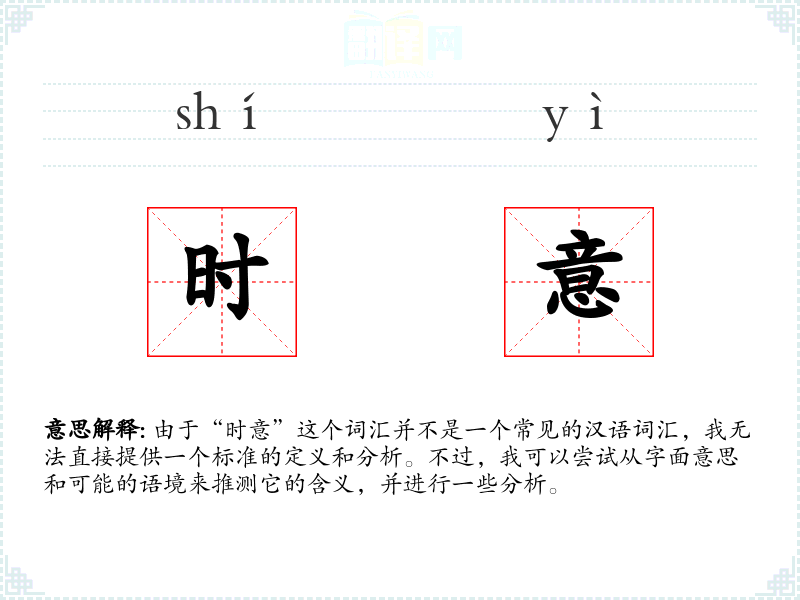 由于“时意”这个词汇并不是一个常见的汉语词汇,我无法直接提供一个标准的定义和分析。不过,我可以尝试从字面意思和可能的语境来推测它的含义,并进行一些分析。