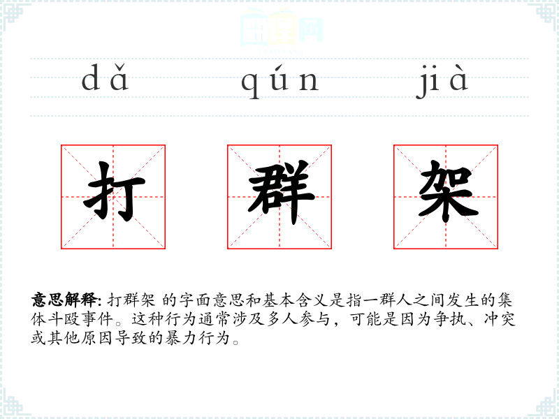 在英语中,类似的词汇可能是“brawl”或“riot”,它们在描述集体暴力行为时与“打群架”有相似的含义,但在具体用法和文化内涵上可能有所不同。