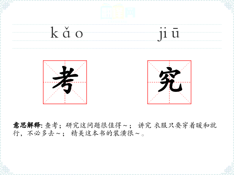 查考;研究这问题很值得~; 讲究 衣服只要穿着暖和就行,不必多去~; 精美这本书的装潢很~。