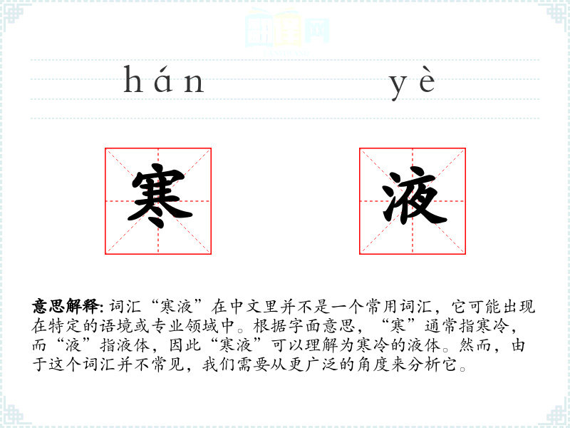 词汇“寒液”在中文里并不是一个常用词汇,它可能出现在特定的语境或专业领域中。根据字面意思,“寒”通常指寒冷,而“液”指液体,因此“寒液”可以理解为寒冷的液体。然而,由于这个词汇并不常见,我们需要从更广泛的角度来分析它。