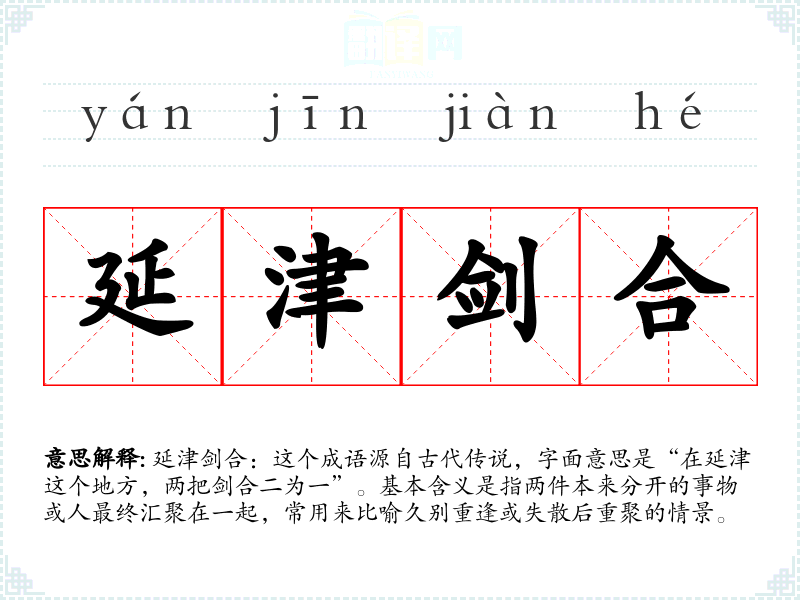 总结:延津剑合这个成语不仅是一个美丽的比喻,也是文化中对重逢和团圆情感的深刻体现。 反思*:在语言学和表达中,理解和运用这样的成语可以丰富我们的词汇和表达方式,增强语言的情感表达能力。
