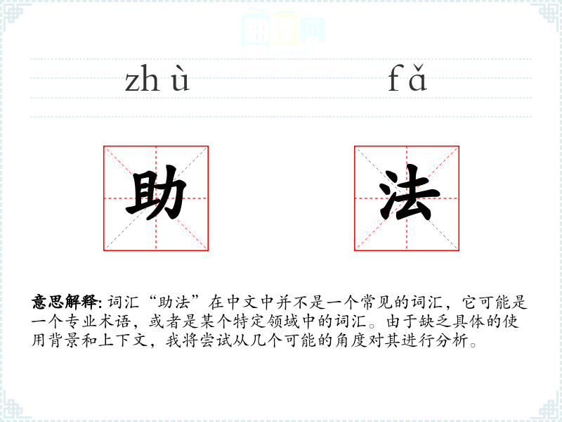 “助法”作为一个词汇,其具体含义需要根据上下文来确定。在学习和使用时,重要的是理解它在特定领域中的具体应用和意义。对于语言学习者来说,了解词汇在不同语境中的用法是非常重要的。