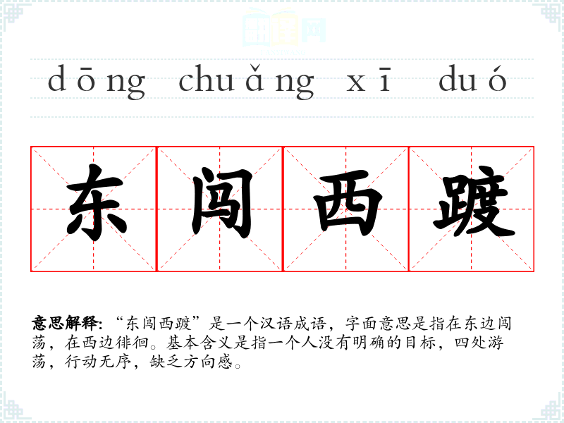 “东闯西踱”是一个汉语成语,字面意思是指在东边闯荡,在西边徘徊。基本含义是指一个人没有明确的目标,四处游荡,行动无序,缺乏方向感。