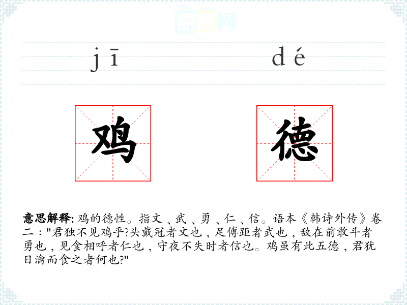 鸡的德性。指文﹑武﹑勇﹑仁﹑信。语本《韩诗外传》卷二﹕"君独不见鸡乎?头戴冠者文也﹐足傅距者武也﹐敌在前敢斗者勇也﹐见食相呼者仁也﹐守夜不失时者信也。鸡虽有此五德﹐君犹日瀹而食之者何也?"