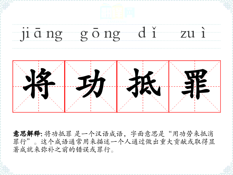 将功抵罪 是一个汉语成语,字面意思是“用功劳来抵消罪行”。这个成语通常用来描述一个人通过做出重大贡献或取得显著成就来弥补之前的错误或罪行。