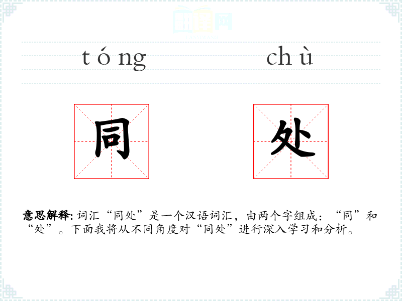 词汇“同处”是一个汉语词汇,由两个字组成:“同”和“处”。下面我将从不同角度对“同处”进行深入学*和分析。