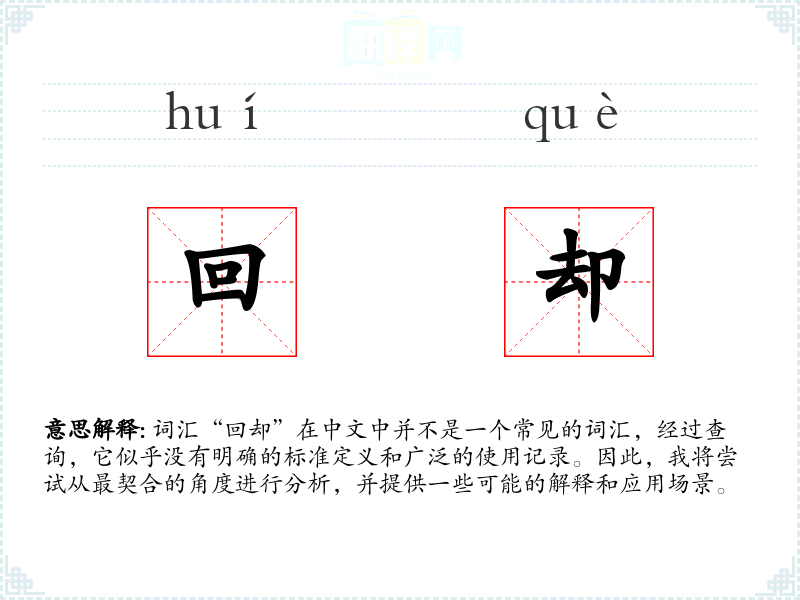 由于“回却”不是一个标准词汇,我们可以尝试从字面上理解它。"回"通常意味着返回或回复,"却"可以表示退却或拒绝。结合起来,"回却"可能意味着返回并拒绝,或者在某种程度上表示一种矛盾的行为,即一方面返回,另一方面却拒绝继续前进。