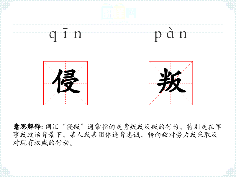 词汇“侵叛”通常指的是背叛或反叛的行为,特别是在军事或政治背景下,某人或某团体违背忠诚,转向敌对势力或采取反对现有权威的行动。