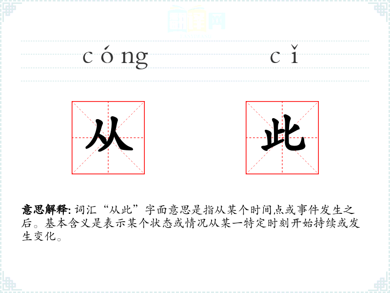 词汇“从此”字面意思是指从某个时间点或**发生之后。基本含义是表示某个状态或情况从某一特定时刻开始持续或发生变化。