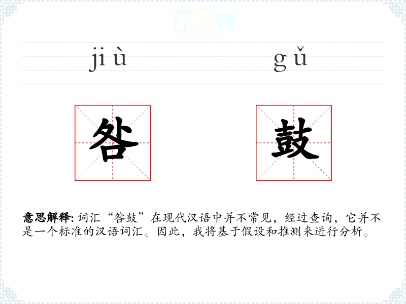 结合这两个字,我们可以推测“咎鼓”可能指的是一种用于提醒或警示过错的鼓声,或者是一种通过鼓声来表达责备或警示的仪式或活动。