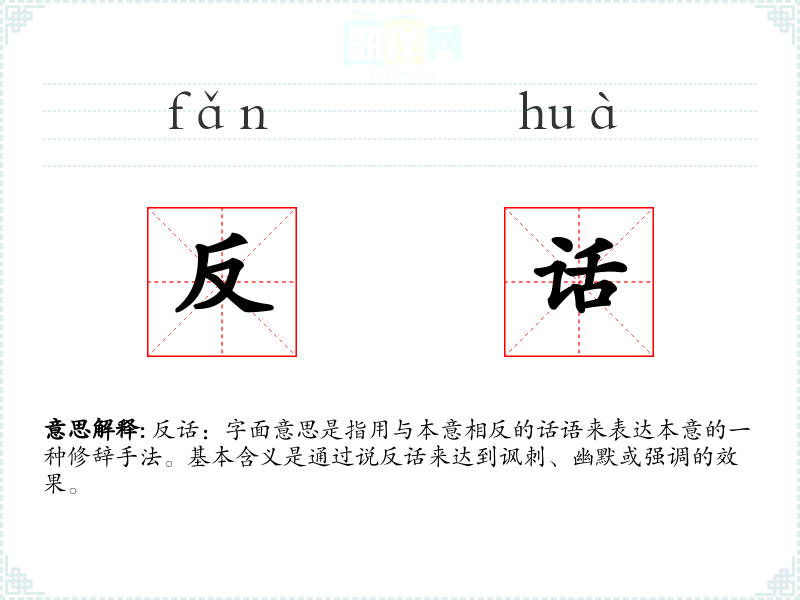 反话:字面意思是指用与本意相反的话语来表达本意的一种修辞手法。基本含义是通过说反话来达到讽刺、幽默或强调的效果。