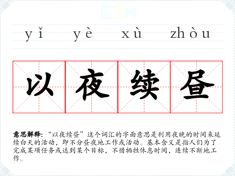 “以夜续昼”这个词汇源自汉语,其结构为“以...续...”,表示用一种状态来延续另一种状态。在古代文献中,这个词汇可能用来形容那些勤奋的学者或官员,他们在夜晚继续白天的学*或工作。随着时间的推移,这个词汇的含义和用法逐渐扩展,现在更多地用来形容任何需要连续工作的情境。